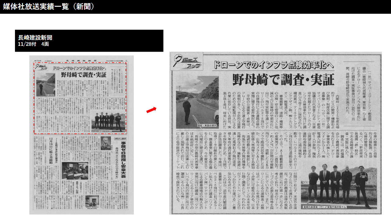 2025年11月28日 4面に「ドローンでのインフラ点検効率化へ 野母崎で調査・実証」の見出しで記事が紙面に記載されています。